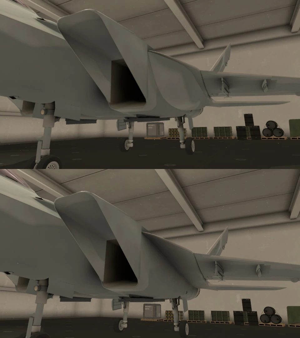 The Conformal Fuel Tanks (CFTs) are an addon available for the F/A-26B, applied in the same way its external TGP would be. Like the TGP addon, the CFTs cannot be jettisoned. The CFTs allow the F/A-26B to hold an extra 6400 total liters of fuel for flight. This has the main benefit of being able to greatly increase its maximum flight range without taking up its extra fuel tank ports. This gives the pilot an advantage in armament for super long-range or otherwise long-term missions. On the other hand, this brings about a very heavy penalty to your Thrust to Weight Ratio with greater amounts of fuel being loaded in. This can make maneuvering in short order a great challenge, and may necessitate a fighter escort in missions where hostile fighters and/or interceptors are a threat. Even so, the CFTs can make for a fair addon in roles where maneuvering isn't much of a problem.