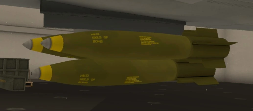 The Mk. 82AIR High Drag Bomb is a variant of the standard Mk. 82 Bomb available for the AV-42C and F/A-26B to utilize. It is equipped with a drogue chute in the back that deploys promptly after its release. The main use of this bomb as opposed to its counterpart is use in low-altitude bombing tactics. It is designed to resolve an old dilemma with unguided bombs: if a bomb is dropped from a very low altitude, the deploying aircraft runs a high risk of getting caught in the bomb's explosion themselves as the bomb will impact its target right as the aircraft is passing over it. The Mk. 82AIR bomb is built to solve this problem in the battlefield; once dropped, it quickly deploys a drogue chute behind itself. This slows its horizontal velocity enough without impacting its vertical drop-speed so that the deploying aircraft can move away from the target before the bomb's impact. Its deployment and tactical employment are largely identical to the standard Mk. 82 otherwise.